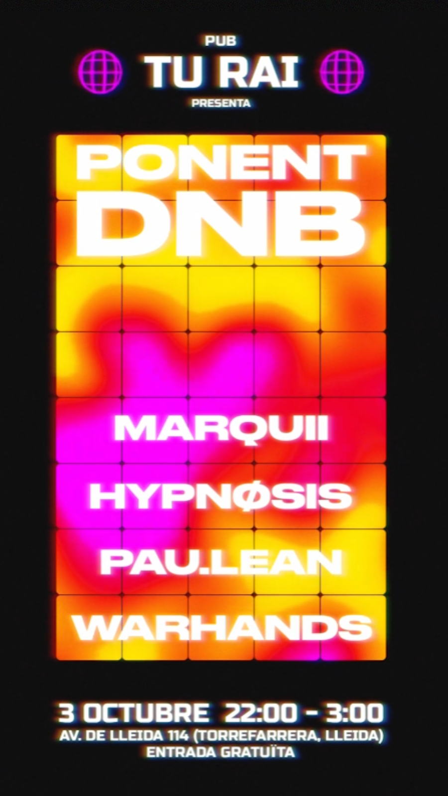 Agenda 3 d'octubre 22h Pub Tu Rai Ponent DNB Ponent DNB torna, aquest cop a Torrefarrera, en un horari extés i amb els nostres DJs locals Marquii Hypnøsis Pau.lean Warhands